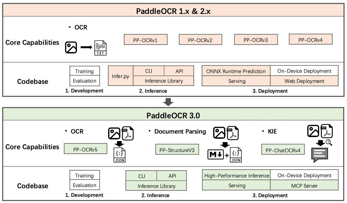 무엇보다 PaddleOCR 3.0의 차별점은 “정확도 개선”만으로 끝나지 않고, 코드베이스와 배포 경로를 제품 수준으로 정리하려는 공학적 선택에 있다. 리포트는 2.x에서 드러난 구조적 문제(전역 CLI 파라미터 비대화, 설정 공유 어려움, 학습 툴킷/추론 라이브러리 경계 불명확 등)를 직접 지적하고, PaddleX 기반의 레이어드 아키텍처로 학습/추론/배포를 분리해 유지보수성과 확장성을 확보했다고 설명한다.