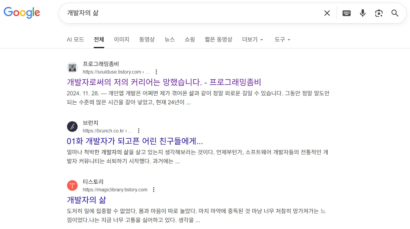 구글 검색어에 개발자의 삶이라고 검색을 해보았습니다.