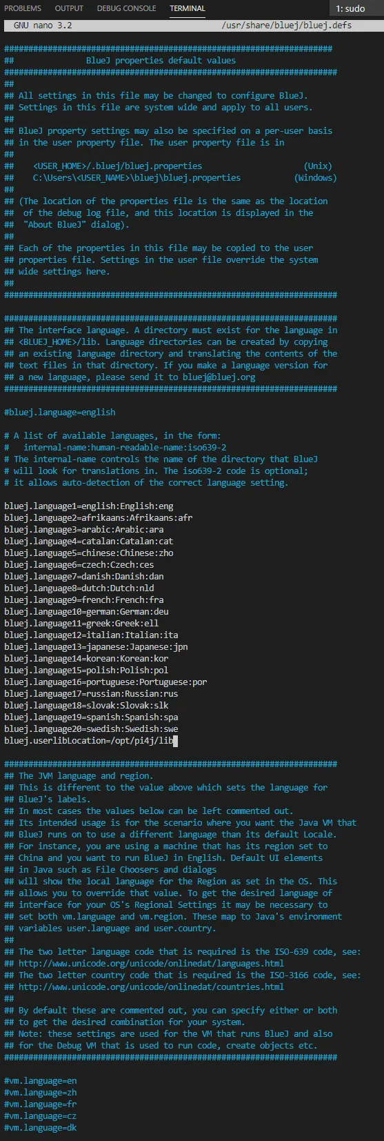 nano 에디터로 BlueJ 설정파일을 열고나서 Ctrl키와 W키를 눌러 "userlibL"를 입력하여 편집할 위치로 이동합니다. 그리고 나서 아래의 설정정보를 입력하고 저장하면 됩니다.