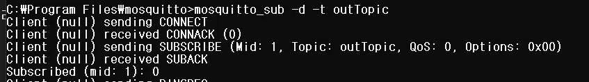 그리고 이전에 실습한 mqtt client 단에서 한 작업에서 다음과 같은 명령어를 입력하여 실습을 해본다. (mqtt 수신자(구독자) 서버를 실행하는 작업)
