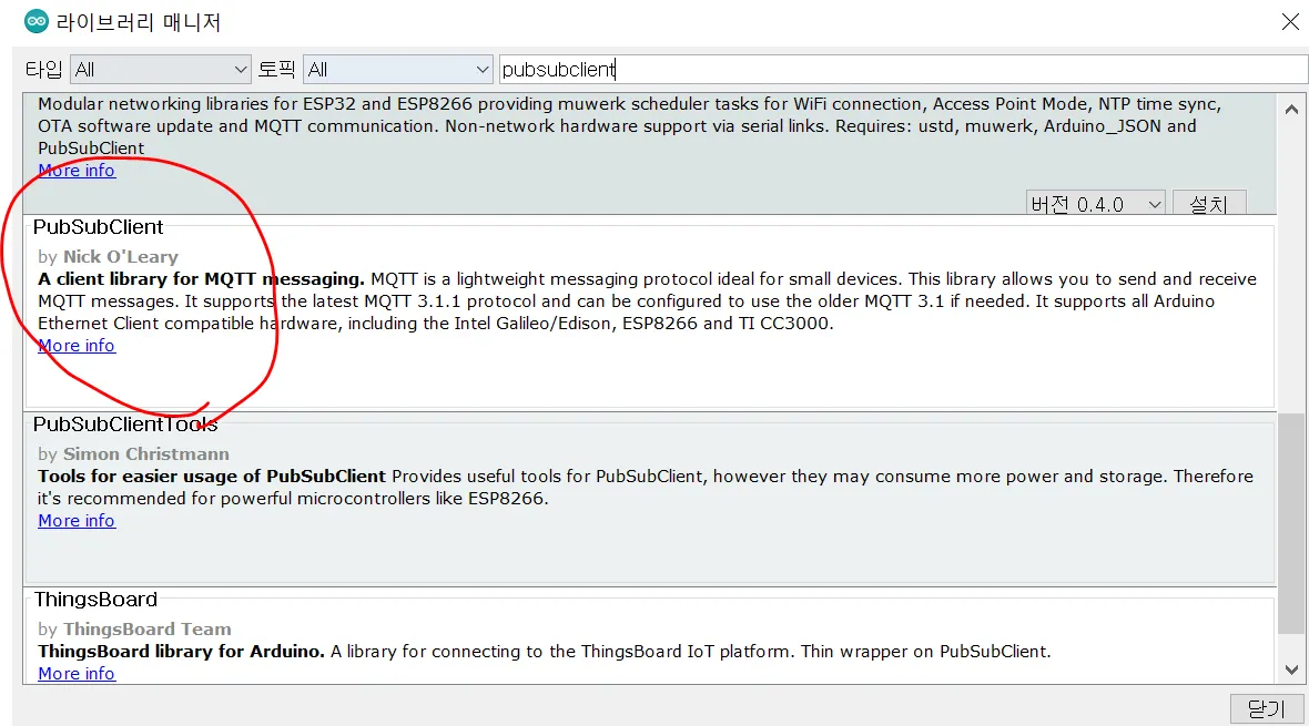 검색 창에 pubsubclient라고 검색해서 다운로드
