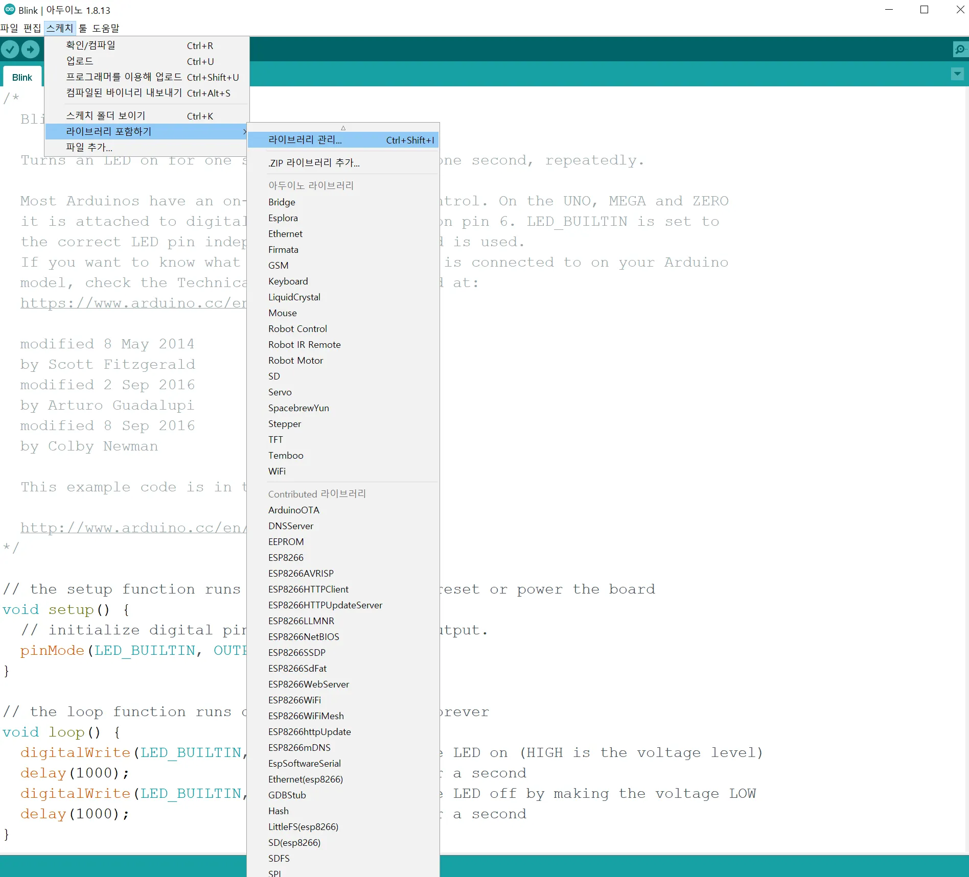 아두이노 실행하고 스케치 클릭 후 라이브러리 포함하기 다음 라이브러리 관리 클릭