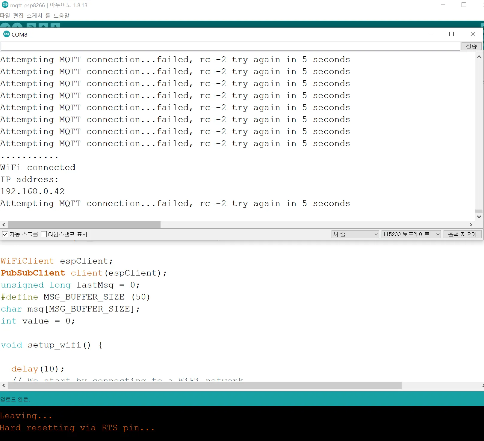 정상적인면 mqtt 연결이 되야하는데 자꾸 이 문자만 출력이 된다.