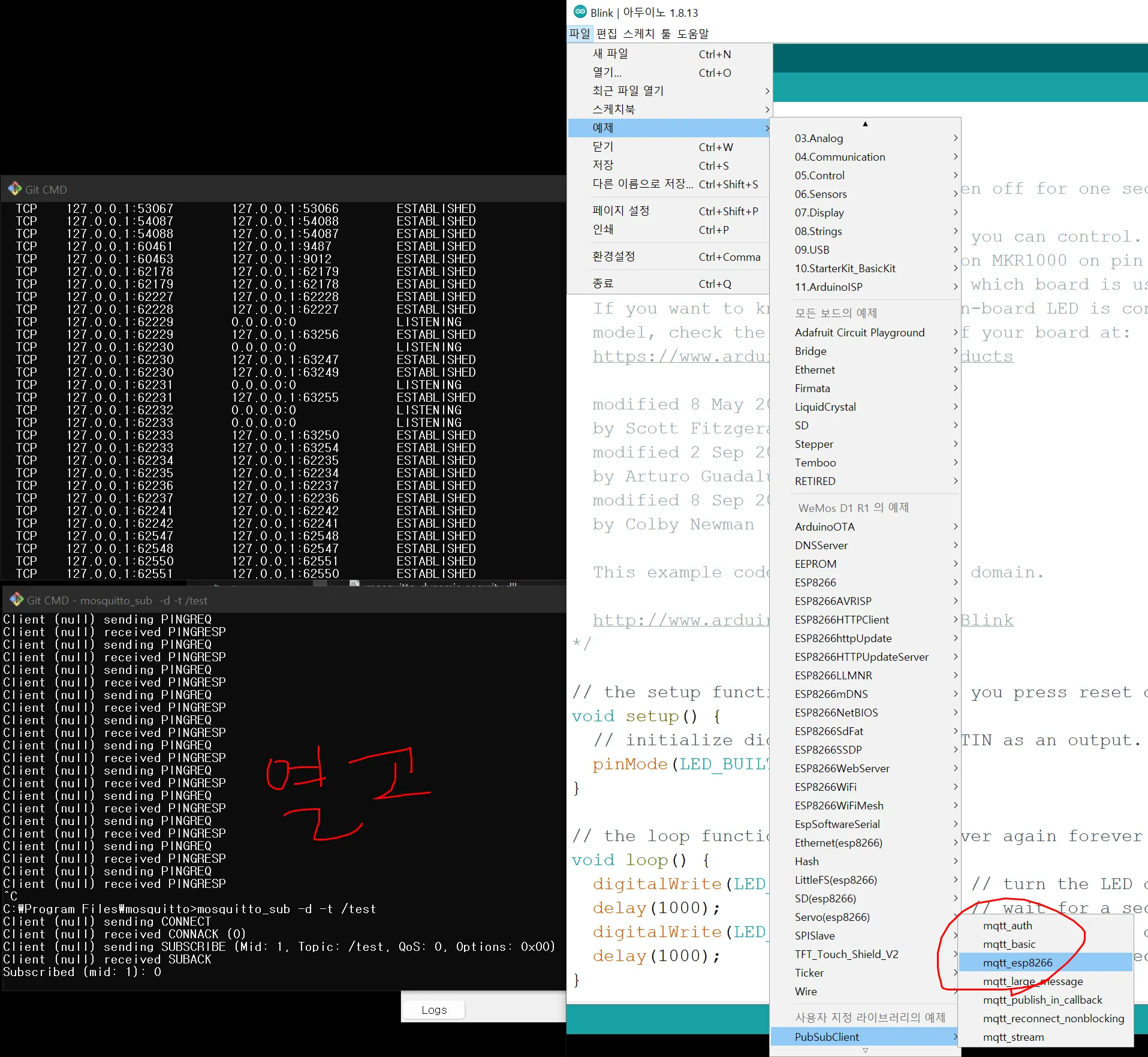 MQTT 설치 할 때 예제로 배웠던 작업 mqtt_sub을 열고 아두이노 스케치에 파일 탭에서 예제 →PubSubClient→mqtt_esp8266 클릭