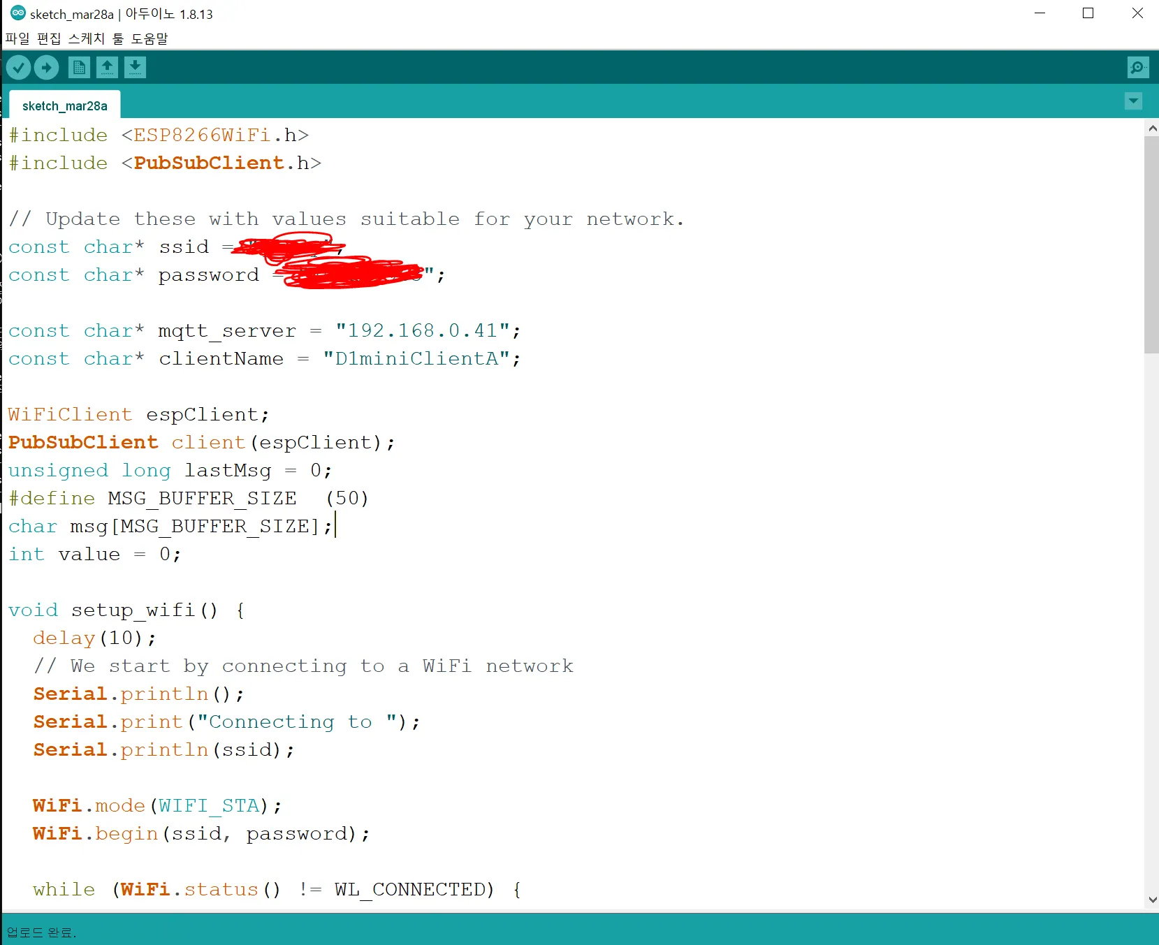 그리고 마지막으로 mqtt server는 본인이 연결할 pc (window면 window, rasp 등등)의 ip를 입력한다.