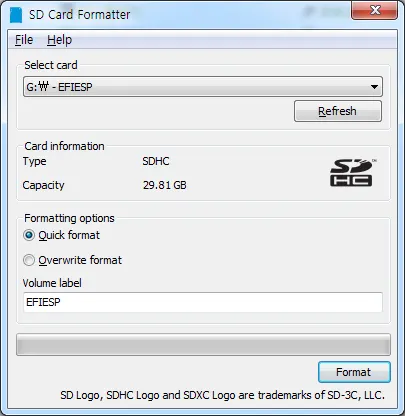 자 그러면 설치한 SD Card Formatter를 실행시키고 그러면 현재 삽입된 Micro SD 카드의 드라이브 명을 확인하고, Select Card에서 SD 카드 드라이브를 선택한다.